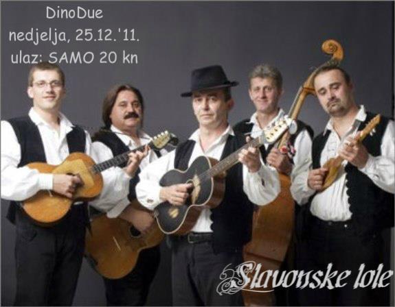 Kako bi fešta bila što bolja, pripremamo Vam pravu tamburašku poslasticu. Samo za Vas, naši dragi gosti, organiziramo koncert popularnog tamburaškog sastava ‘SLAVONSKE LOLE’ koji će DinoDue zapaliti svojim velikim hitovima ‘Sve je ona meni’, ‘Srce mi puno radosti’, ‘Ledina”, ‘Prijatelju nije lako’ … Popularni tamburaši sa svojom neiscrpnom energijom svirat će sve dok ima rezervnih žica. Svi njihovi obožavatelji znaju kako to izgleda, a oni koji će im se prvi put pridružiti oduševit će punina zvuka malih, ali svemogućih tamburica i snaga glasova raspjevanih Lola.