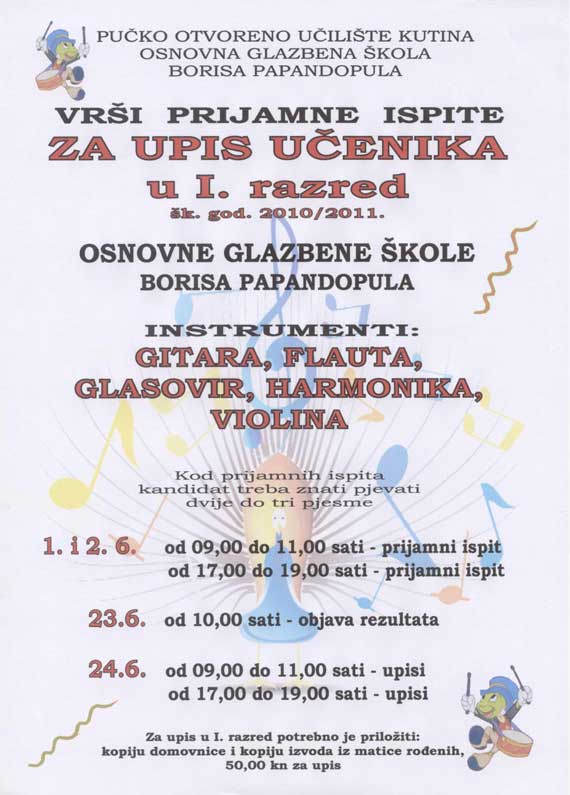 U tijeku su upisi u Poprock školu. Poprock škola do 20. rujna 2010. godine obavlja upis zainteresiranih učenika. Zainteresirani učenici mogu odabrati učenje solo gitare, bass gitare, klavijatura, bubnjeva, rock pjevanja, saksofona, klarineta ili flaute. Sve informacije o upisu u Kutini možete dobiti na telefon + 385 95 9...