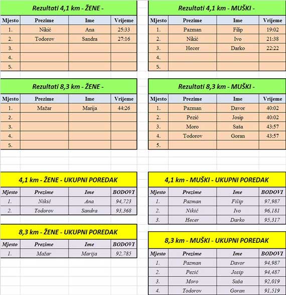 Najmlađi a ujedno i najbrži među muškima na 4km, bio je Filip Pazman a zanimljivost je ta da je na 8,3km pobijedio i njegov otac Davor, koji je u foto-finišu pobijedio već sada legendarnog Josipa Pezića. Očito će 2.kolo biti puno zanimljivije jer slijedi lov na obitelj Pazman i pokušaj obaranja njihovih rezultata. Na utrkama su sudjelovale i tri žene što je odličan poziv i ostalim neodlučnim curama, djevojkama, ženama da im se priključe u slijedećem kolu.