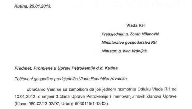 obraćamo Vam se sa zamolbom da još jednom razmotrite Odluku Vlade RH od 10.01.2013. o smjeni 3 člana Uprave Petrokemije i imenovanju novih članova Uprave (Klasa: 080-02/13-02/07, Urbroj:5030115/1-13-03).