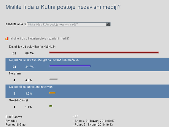 Na našem portalu, svi vi koji ste nas posjećivali, mogli ste primijetiti anketu koja je aktualna punih mjesec dana. Anketom se htjelo saznati što naši građani misle o nezavisnosti kutinskih medija. Prvi glas čitatelj je dao 21. travnja te smo danas, mjesec dana kasnije, napravili analizu.