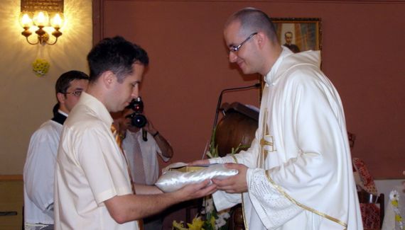 Zanimljivo je da je Robert Jonjić, a što je prvi puta zabilježeno u kutinskoj crkvi zaređen za đakona 26. prosinca prošle godine nakon uspostave Sisačke biskupije, a što je učinio imenovani biskup mons. Vlado Košić. Nedjeljnjo slavlje započelo je u obiteljskom dvorištu mladomisnika u Radićevoj 42 u Kutini. Prve riječi potpore u svećeničkoj službi izrekao mu je brat Bernard. Blagoslovila ga je majka Marija, a molitvom, osobito u mnoštvu koje je formiralo procesiju, pratila baka Milka. Ona ga je, kako je više puta rekao i prva učila molitvi. Sliku svečane procesije pjesmom upotpunili su Mješoviti i Zbor mladih kutinske župe te šarenilom moslavačkih nošnji mjesni KUD “Seljačka sloga”.