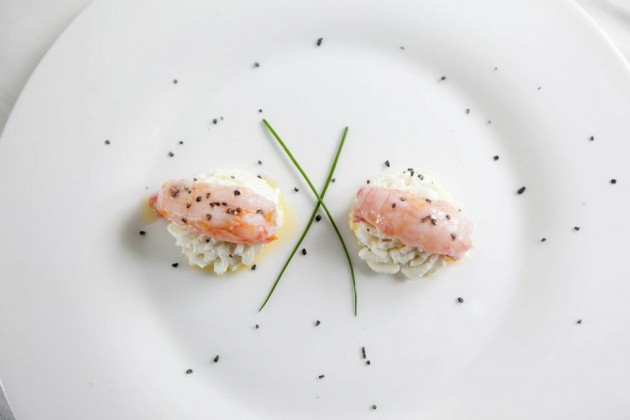 Graševina Goldberg – Belje berba 2009. servirana uz lomljena zrna pšenice s dimljenim kozicama, pedoćima i hobotnicom.