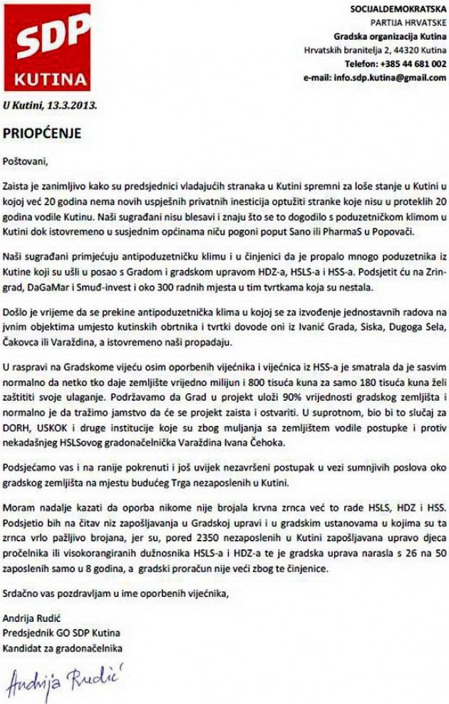 Priopćenje predsjednika GO SDP Kutina i kandidata za gradonačelnika prenosimo u cijelosti.